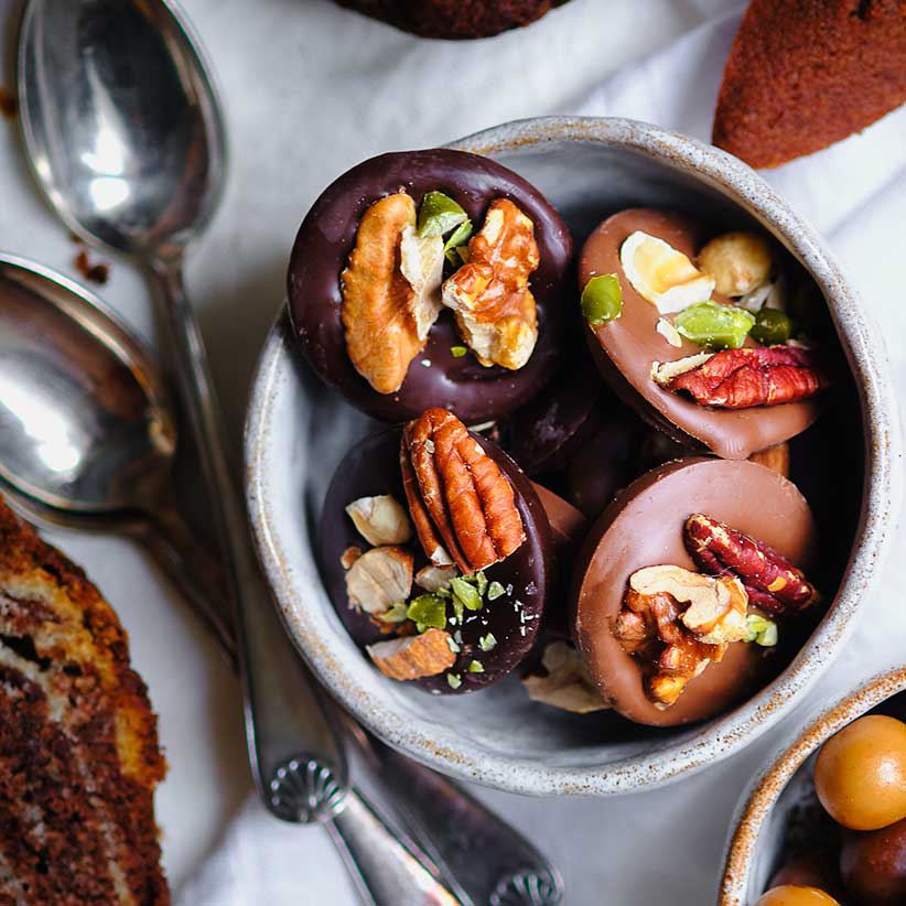 Amandes. Noisettes. Chocolat végétal Linnolat noir, façon lait et caramel.